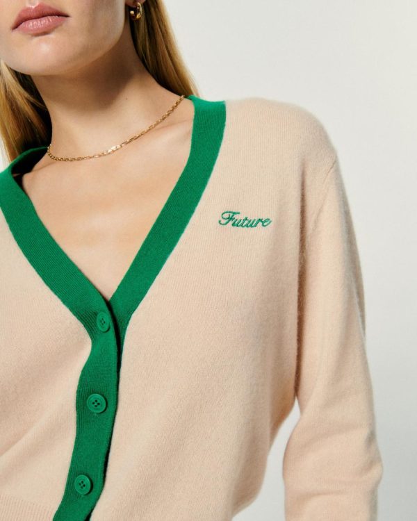 Inspiration collège et élégance intemporelle pour ce pull cardigan court bicolore, confectionné en cachemire 2 fils. Muni de manches longues et de bords côtelés, il arbore une signature brodée « Future » à la poitrine et des bandes contrastées le long du col V et de la fermeture boutonnée. Rejoignez le Club !