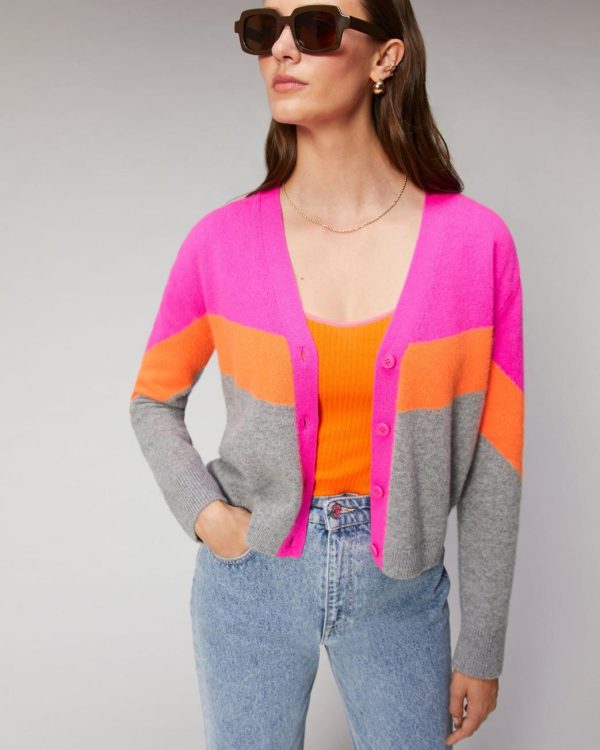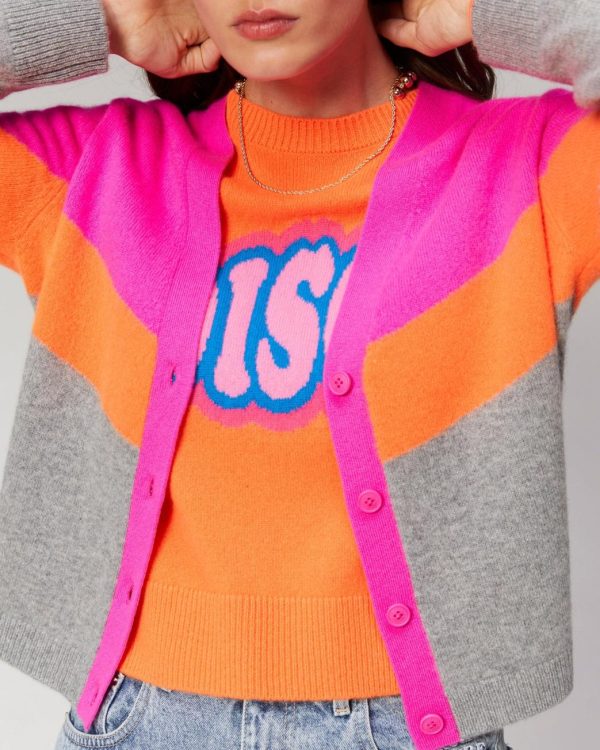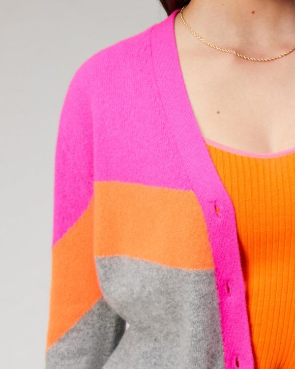 Couleurs vibrantes et bandes tricolores pour ce pull cardigan court en maille 100% cachemire. Muni d’un col rond et de manches longues, il dévoile une fermeture boutonnée siglée « From Future ».