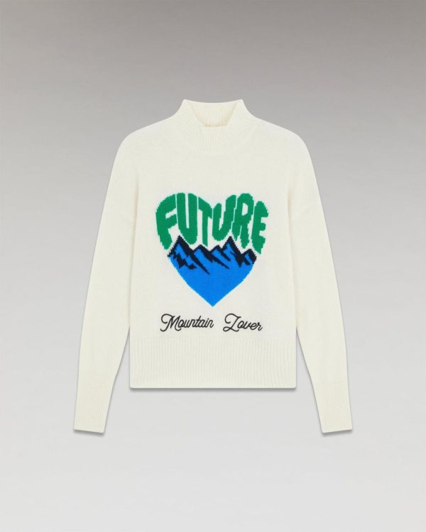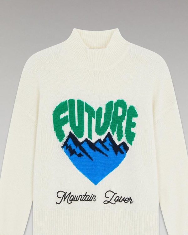 Soyez prêt à conquérir les sommets de style avec notre pull confectionné en cachemire 4 fils. Muni d’un col montant, de manches longues et de bords côtelés, un cœur orné de montagnes et d’une signature « Future » se dévoile, ponctué d’une broderie « Mountain Lover ». Infiniment doux et réconfortant, glissez-le sur une robe en maille ou mixez-le à un pantalon fluide.