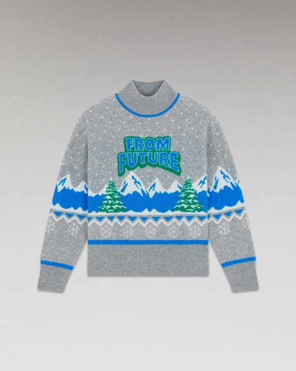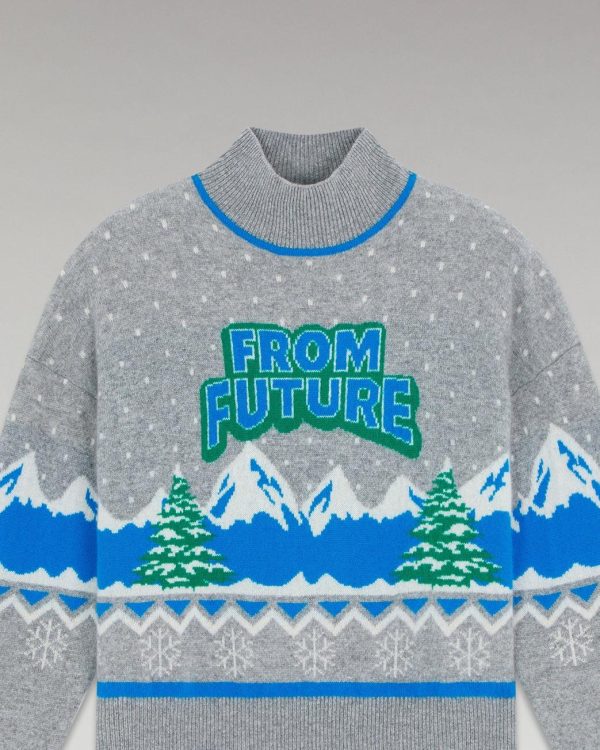 Confectionné en cachemire 2 fils, ce pull oversize vous transporte au cœur des sommets étoilés. Muni d’un col montant et de manches longues, des lignes futuristes soulignent les bords côtelés. Orné de flocons de neige, de montagnes enneigées et de sapins majestueux, il arbore fièrement la signature « From Future » à l’avant. Rejoignez le Club et arpentez les pistes avec audace et élégance !