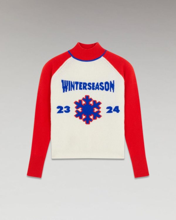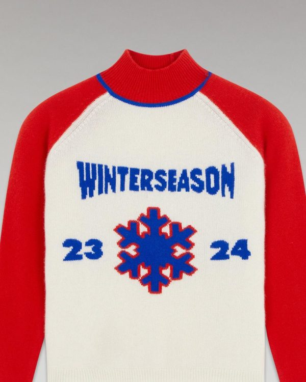 Confectionné en cachemire 4 fils, ce pull oversize incarne la promesse de nouvelles aventures futuristes sur les pistes enneigées. Muni d’un col montant, de manches longues et de bords côtelés, il arbore fièrement un message « Winter Season » et un flocon de neige. Insufflant un style rétro et avant-gardiste, il se mixe aisément à un jean ample ou une jupe en maille.