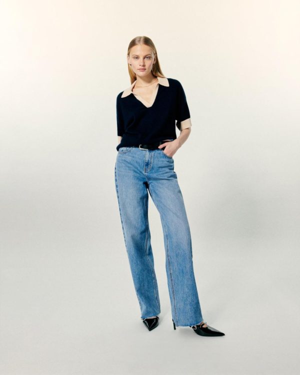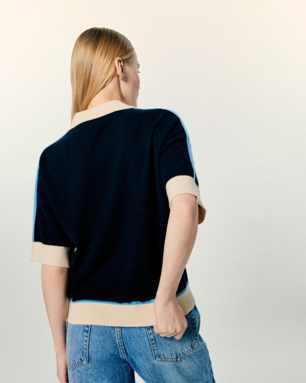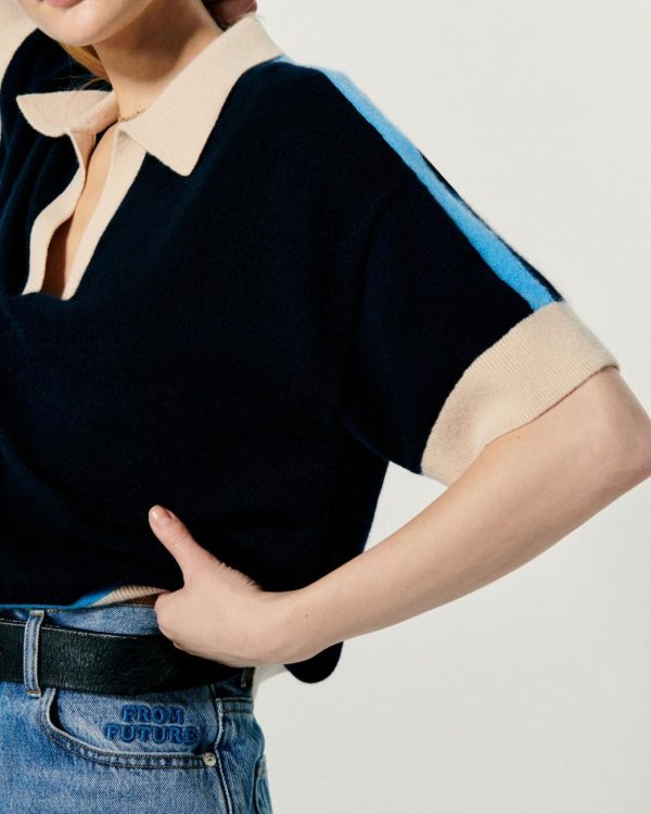 Jeux de lignes pour ce pull court et oversize, en cachemire 2 fils. Muni de manches courtes, il affiche un col polo en V et des bords côtelés contrastés pour transcender votre allure futuriste au quotidien. Mixez-le à un jean ample pour un look chic et casual.