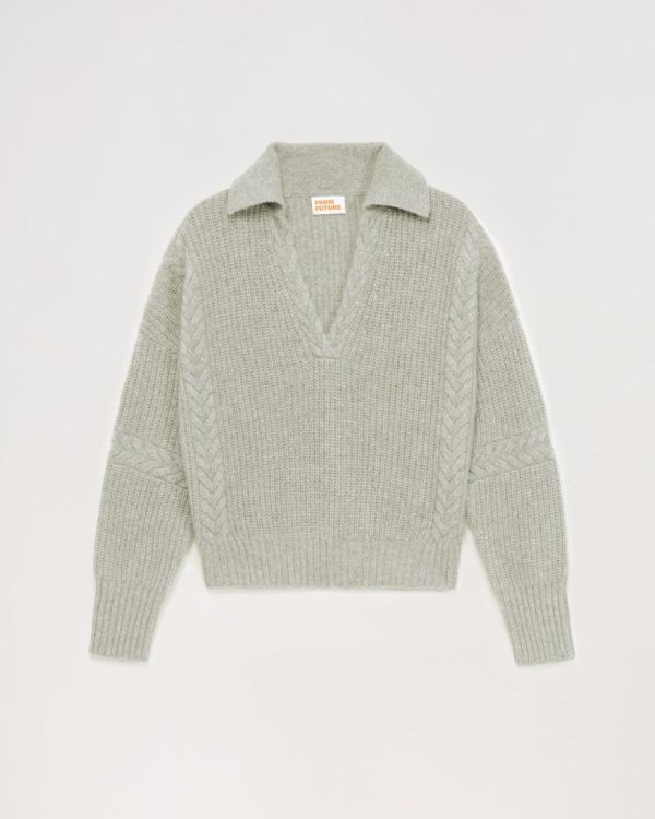 Pull en cachemire 6 fils, maille torsadée ultra chic. Jusque-là c’est assez basique. Mais observez la coupe très « mode » de ce petit bijoux tricoté : col polo, longueur légèrement croppée et manche oversize. Vous allez craquer ?