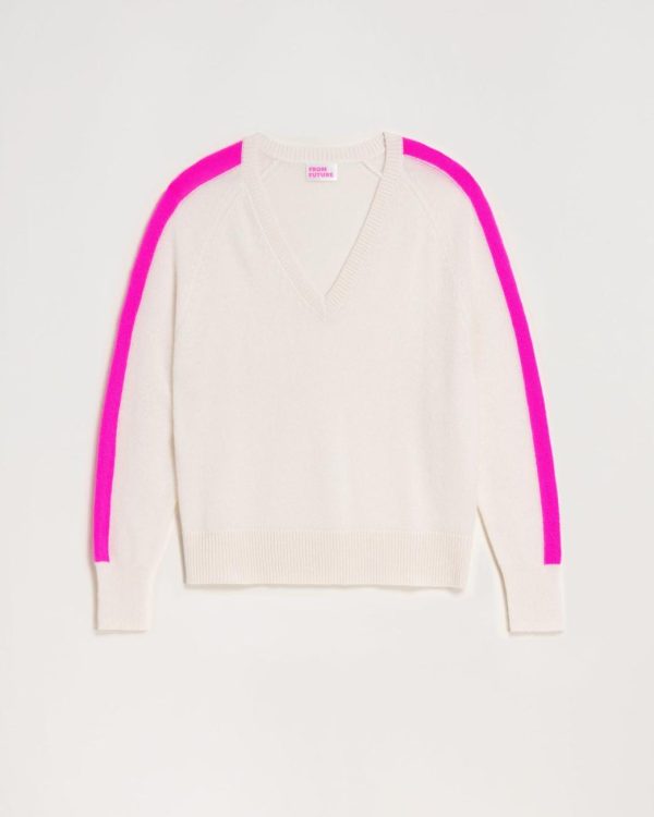 Cols V Cachemire | Femme FROM FUTURE Pull Col V Oversize Bandes Bicolore Léger Ecru