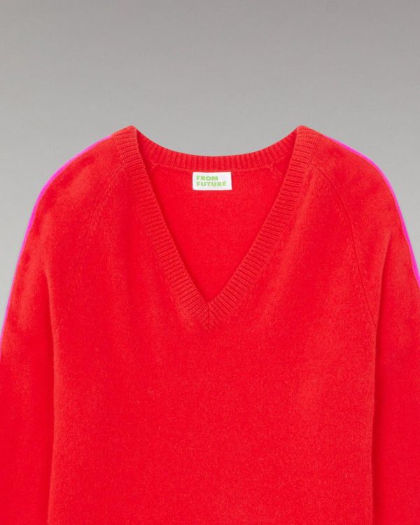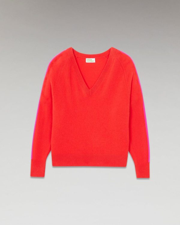 Une maille infiniment douce en cachemire 2 fils s’invite sur ce pull oversize aux lignes futuristes. Muni de bords côtelés et d’un décolleté en V, il révèle des bandes bicolores le long des manches pour structurer la silhouette avec élégance et légèreté. Avec ses teintes vibrantes, ponctuez votre allure avec une jupe satinée ou un jean décontracté.