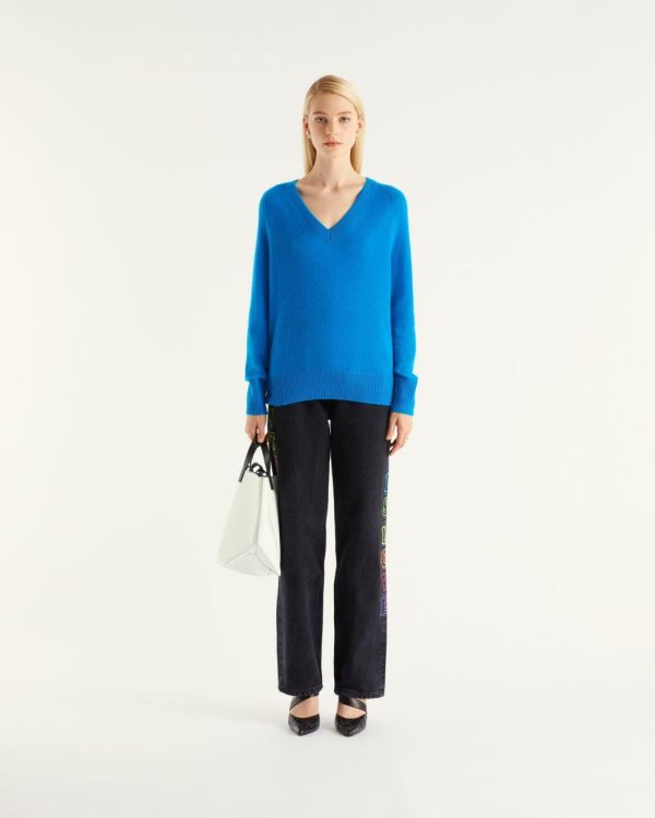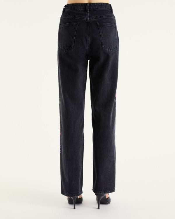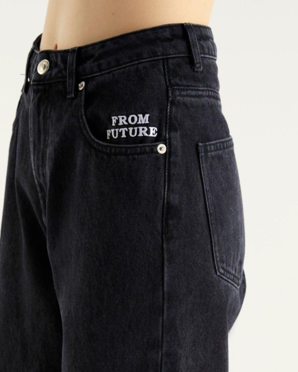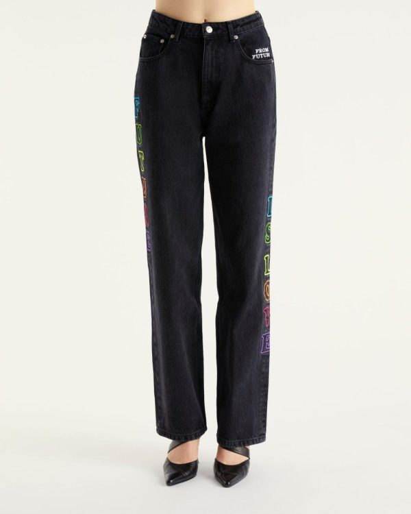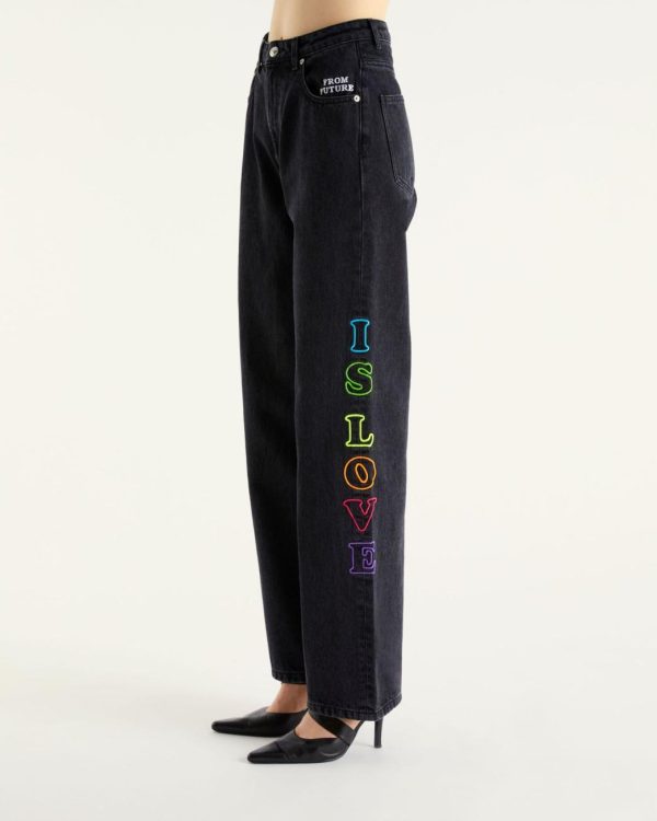 Un jean loose, sans doute le plus cool des flares en ville. Délavages colorés en signature. Détail brodé « Future Is Love » . 5 poches. Fermeture par bouton siglé. Jacron sur l’arrière. Osez la couleur de la tête au pied.