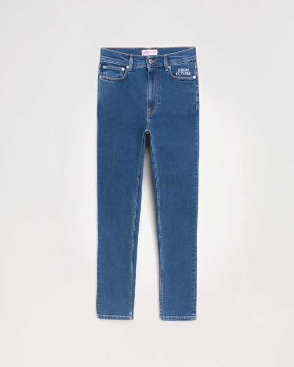 Rencontrez Johnny : Notre jean slim fit avec broderie « From Future » semi-cachée sur la poche gauche. Longueur moulante idéale pour fuseler la silhouette, taille mi-haute. Longueur 7/8ième.