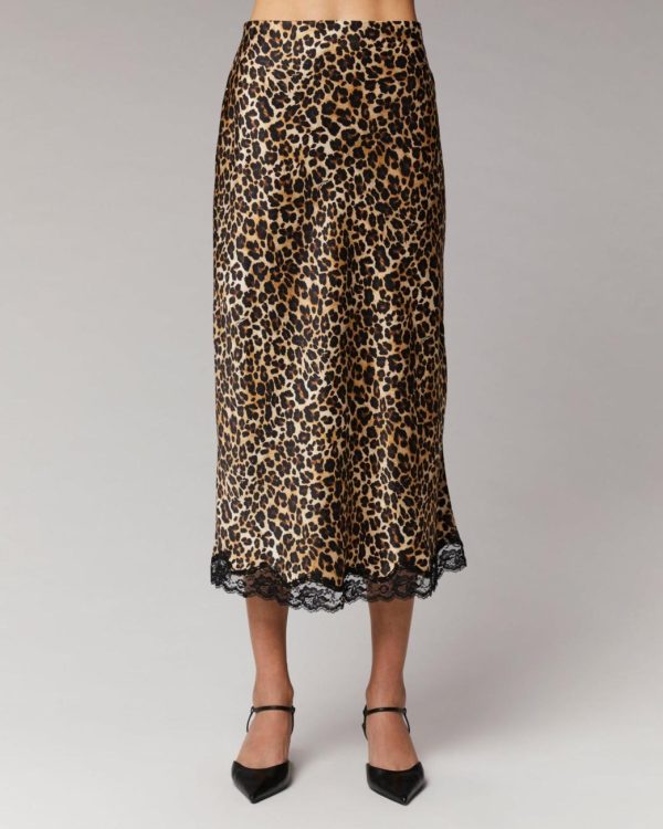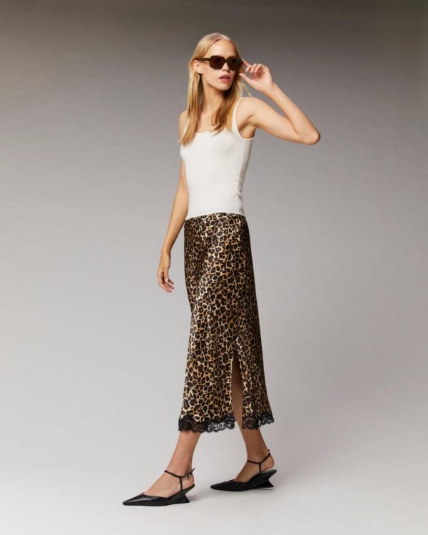 Fusion audacieuse de motifs sauvages et d’élégance futuriste, cette jupe mi-longue vous propulse vers des horizons inexplorés de style. Confectionnée en satin de soie léger et soyeux, elle se pare d’un imprimé léopard, d’une fente sur les côtés et de bords en dentelle. Élastiquée à la taille, elle dévoile une silhouette ajustée en toute fluidité. À accessoiriser selon vos envies, elle se porte sur une chemise satinée ou un top en maille.