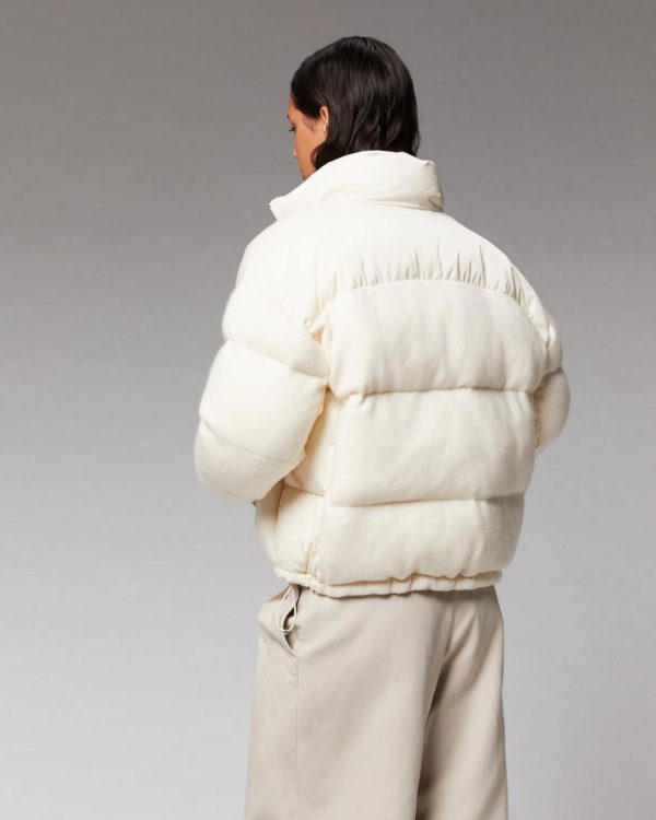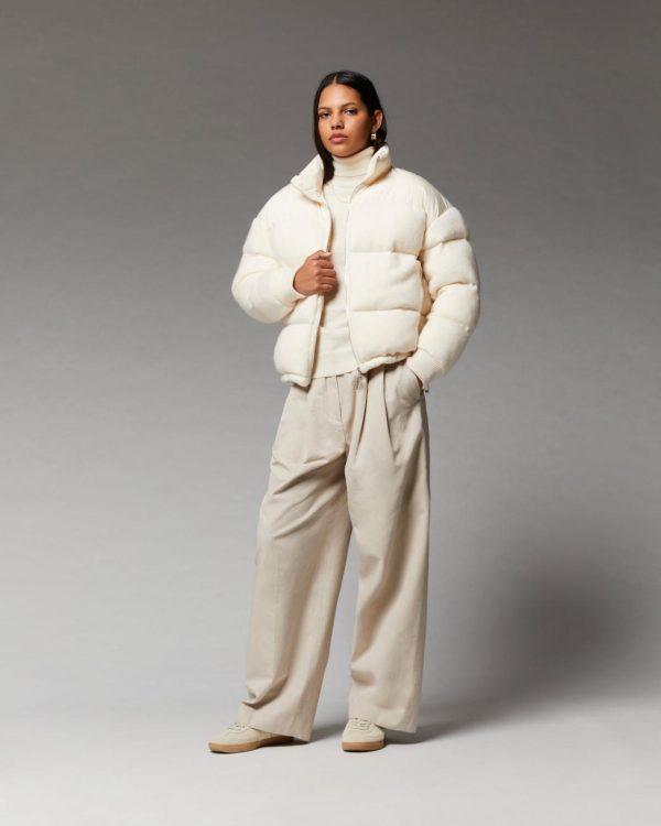 Confectionnée en cachemire 2 fils, cette doudoune oversize et matelassée dévoile un jeu de matières. Munie d’un col montant, de manches longues et de poignets resserrés, elle affiche une fermeture zippée, deux poches et des cordons de serrage sur le bas. Ornée d’une signature « From Future » sur la poitrine, elle séduit par son allure spatiale. Traversez la saison à la pointe du style et mixez-là à un pull doux et un jean casual.