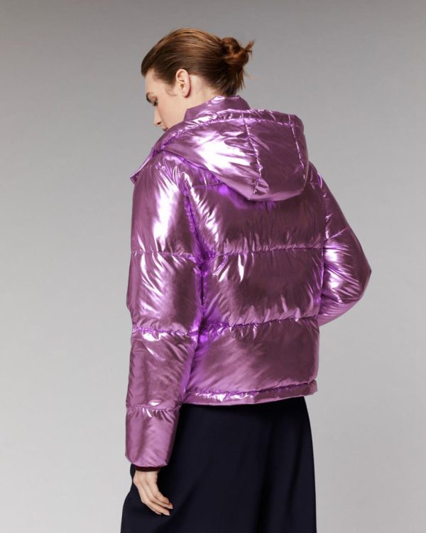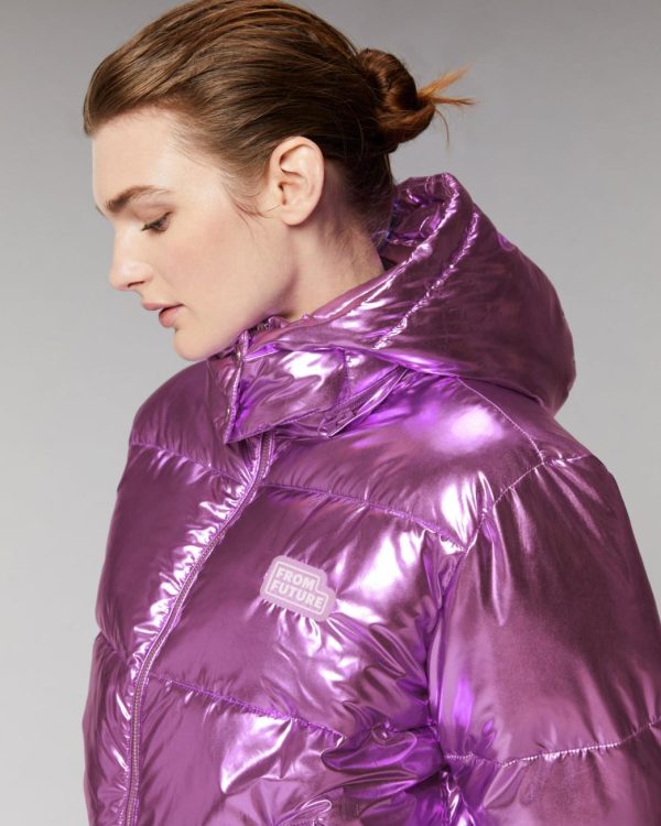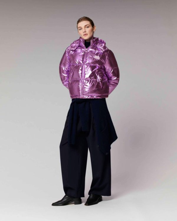 Ornée d’un patch « From Future » sur la poitrine, cette doudoune matelassée et métallisée réinvente l’élégance du futur avec une touche de douceur. Munie d’un col montant, de manches longues et d’une fermeture zippée, elle affiche une capuche et deux poches à boutons pression et des stoppeurs sur le bas. Facile à mixer, elle s’associe à une robe et un cardigan en maille.