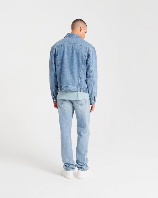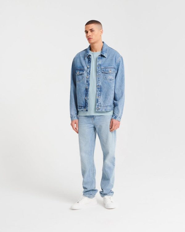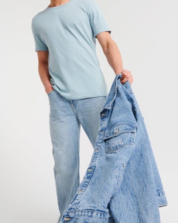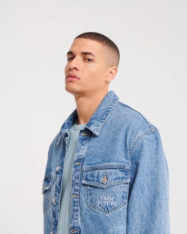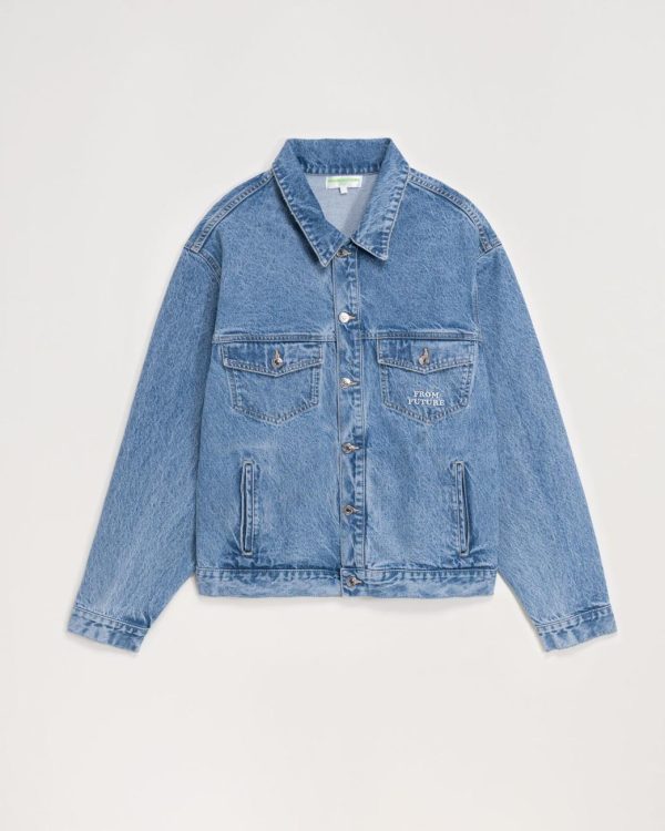 Veste en jean avec détail brodé « From Future » sur la poche frontale gauche. Col à revers, manches longues et manchettes. Poches poitrine plaquées avec rabat et poches latérales à la taille. Ourlet avec pattes à la taille (non ajustable). Fermeture par boutons en métal sur le devant.