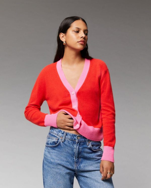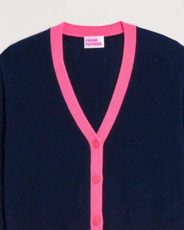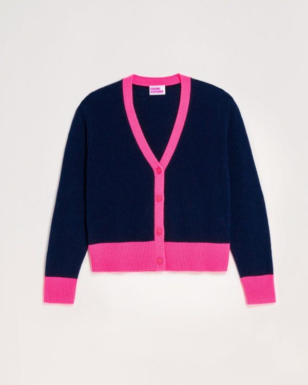 Cardigan bicolore court. Couleurs contrastées au niveau du col, des poignets et du bas de gilet. Boutons tons sur tons siglés avec la patte de boutonnage. et bouton de rappel. Le pull de mi-saison idéal à porter seul ou par dessus une jupe ou une robe en soie. De la couleur pour chasser la grisaille hivernale. Un bon basique du vestiaire FROM FUTURE. Le plus léger de nos cachemires, le plus étudié aussi : 2 fils tricotés en déjaugé pour une maille aérienne et moelleuse, confortable quelque soit la saison.