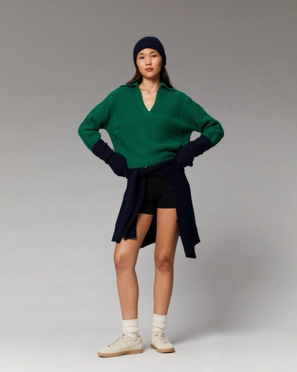 Pull en cachemire 6 fils, maille torsadée ultra chic. Jusque-là c’est assez basique. Mais observez la coupe très « mode » de ce petit bijoux tricoté : col polo, longueur légèrement croppée et manche oversize. Vous allez craquer ?