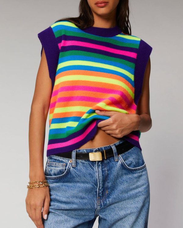 Confectionné en maille 100% cachemire, ce pull sans manches court et oversize est muni d’un col rond et de bords contrastés. Ses rayures multicolores annoncent un futur cosmique vibrant !
