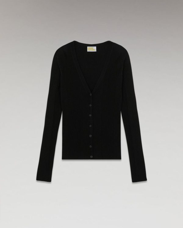 Confectionné en maille côtelée, ce cardigan court s’impose comme un incontournable du vestiaire féminin. En laine mérinos douce et ultra aérée, il dévoile un col V, une fermeture boutonnée et des manches longues. Muni d’une coupe ajustée, il se porte à même la peau ou en superposition.