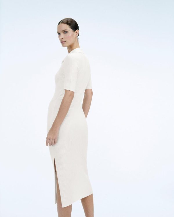 Confectionnée en laine mérinos, cette robe longue et côtelée vous enveloppe d’une douceur infinie. Ornée d’un détail signature à la poitrine, elle dévoile un col chemise en V, des manches courtes soulignées de bords contrastés et une fente sur le bas. À la fois chic et casual, complétez votre look avec une paire de sneakers ou d’escarpins.